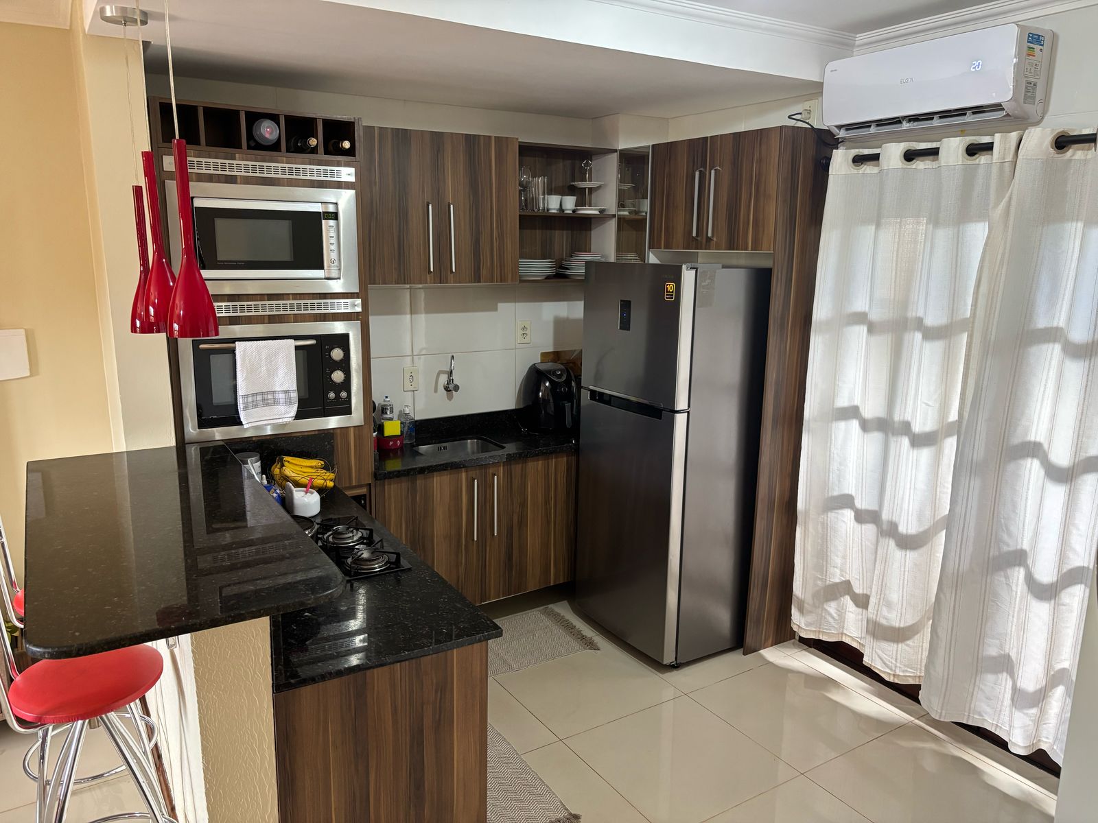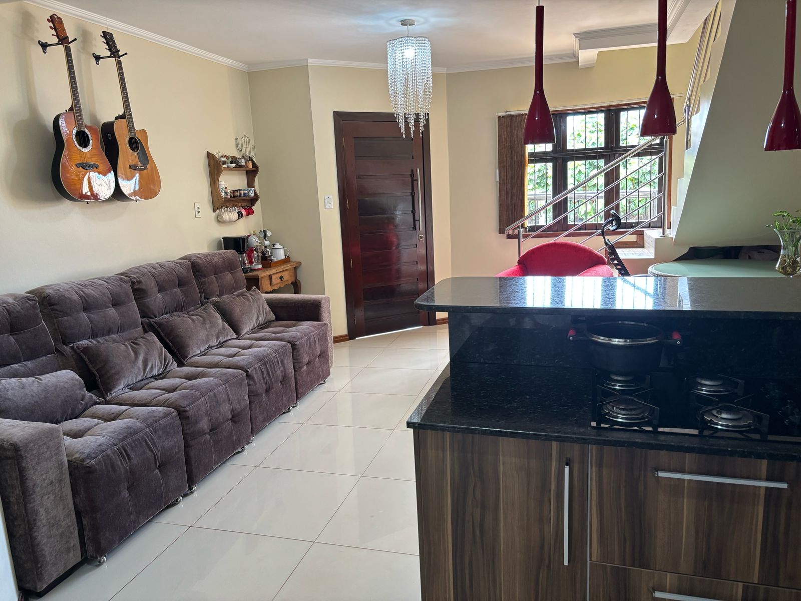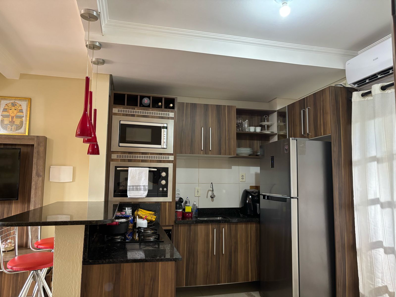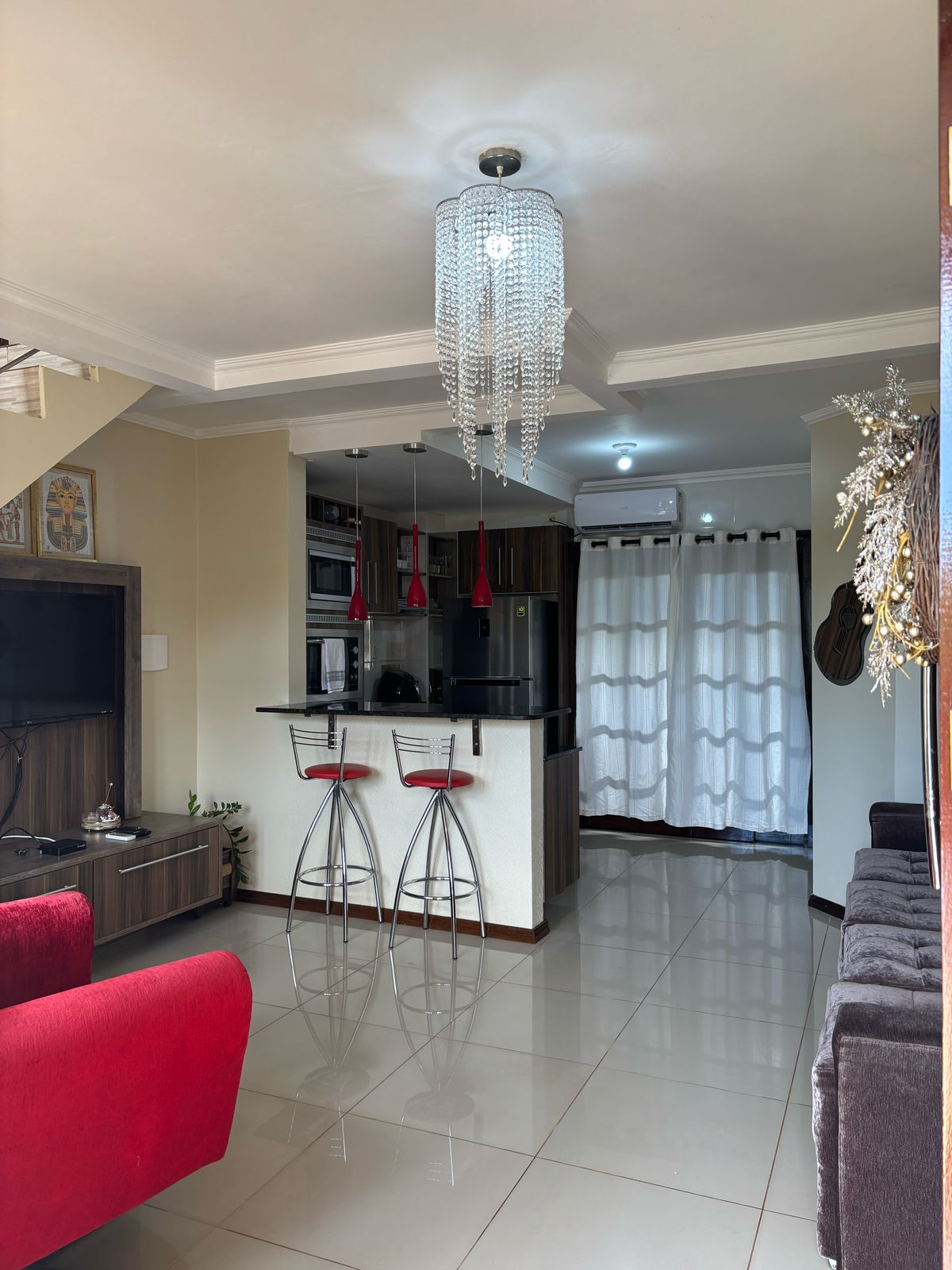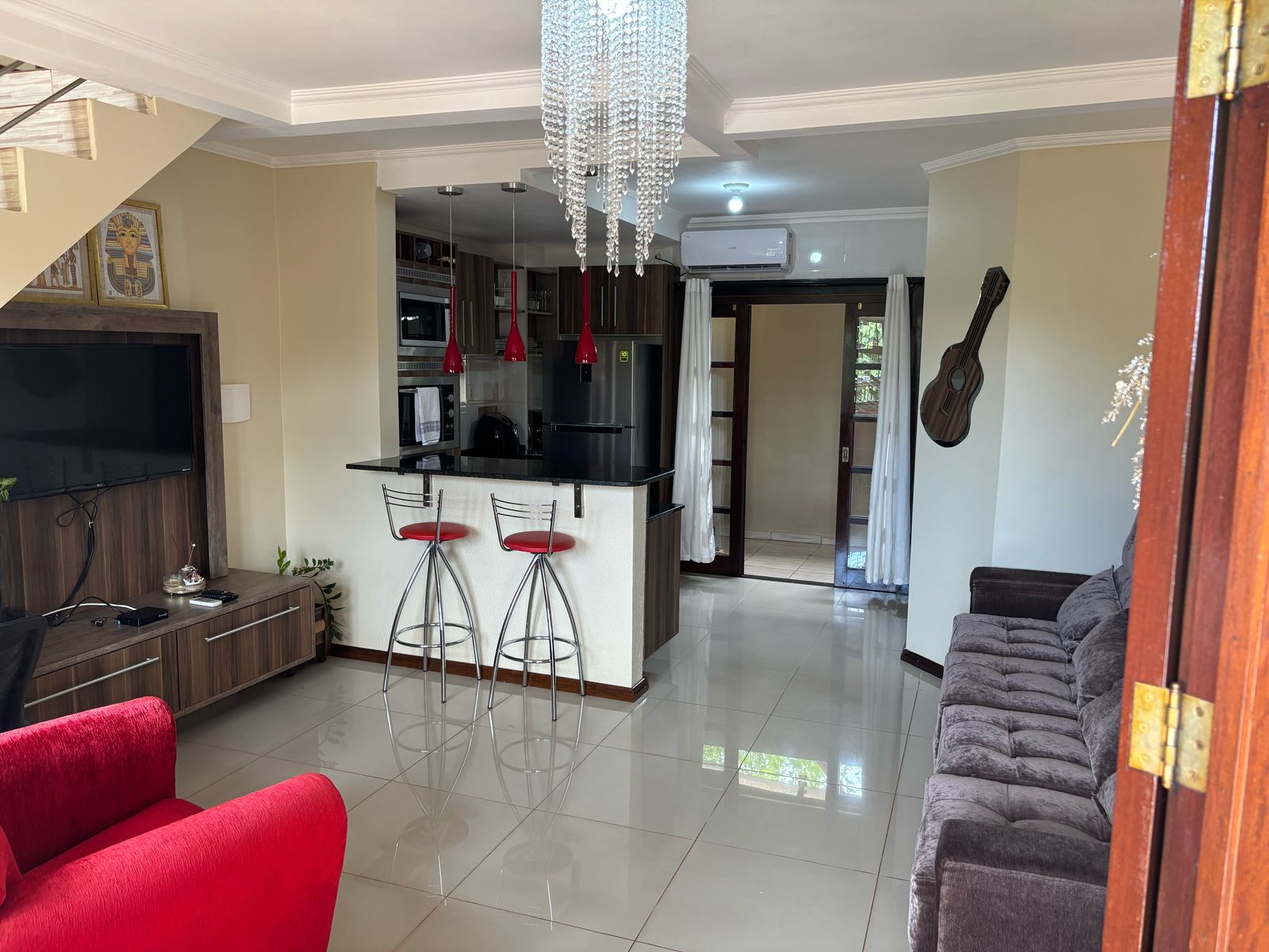 Casa semi mobiliada: cozinha sob medida, painel TV sala e armário banheiro.